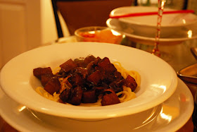 For the entree, I decided to make jajangmyeon because it is my absolute favorite Korean dish. Jajangmyeon is a warm noodle dish topped with a black soybean sauce. The name really describes the dish. "Jajang" means "fried sauce" and "myeon" means noodle. It is really rich and luscious dish, which I thought would make it great for a luxury dinner party. Since this is a dish that I absolutely love, I knew that I would really enjoy making this for my guests and I think it is always important to make something that you can put your heart into.
