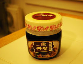 I could have chosen a more expensive cut of beef but I chose this cheaper cut because I wanted something tender for this noodle dish. I've learned from my mother that the best meals don't have to come from the most expensive ingredients but with ingredients that are treated with respect and care. I generously seasoned the beef with salt and pepper. I then browned the meat in the already heated saucepan and after a few minutes added the vegetables back into pan to pan fry. When the meat was almost fully cooked and the onions were crispy, I added a cup and a half of water. The water is important because it helps provide the liquid for the sauce and also helps the cubed potato cook through. While the meat and vegetables continue to stew, I got the most important ingredient - the black bean paste.