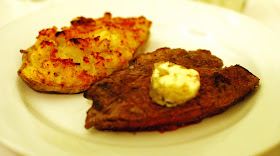 Bret made a really hearty dinner of steak and potatoes. The potatoes were twice-baked and seasoned with butter, caramelized shallots and paprika. Because Bret had some extra caramelized shallots, he made a simple compound butter and I put a generous slice of the butter on my steak.