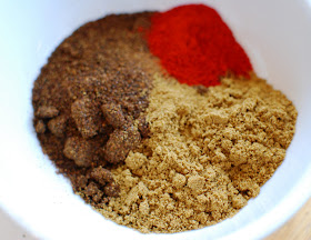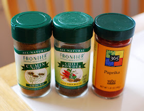 I measured out my seasonings - 1/4 cup chili powder, 2 tablespoons of ground cumin, and 1 teaspoon of sweet paprika.