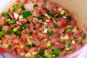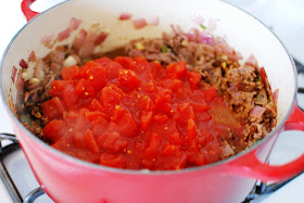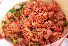 I then added about two pounds of ground beef. My beef was a bit leaner than the recipe called for but I wasn't too worried about the substitution. I browned the beef with the vegetables and used a fork to help break up the beef.