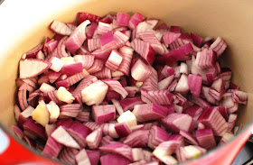 With all of the prep work done, I got cooking! I warmed up my Dutch oven on the stove at medium-high heat with two tablespoons of olive oil. When the pan was warmed up, I added the onions and sauteed them until they were translucent.