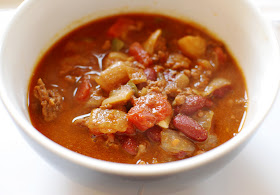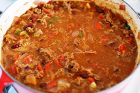 Bret and I have an unspoken rule that no matter what our weekend plans may involve, once football season starts, Bret is always unavailable if there is a Pats game on. I usually join him in the living room to watch the games (with my laptop to write some blog posts) and if I'm feeling up to it, I'll make dishes that are easy to eat on the couch in front of the TV. This past Sunday, I decided to make Bret a huge pot of chili, which is perfect football-friendly food. Plus, it gave me an excuse to use