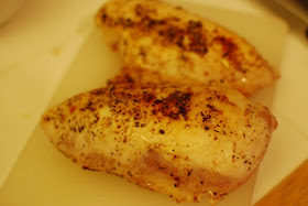 I also trimmed and seasoned my now thawed chicken breasts with salt, pepper, herbs de Provence and cayenne.