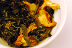 I had the last of my sample dehydrated mushrooms (lobster and black trumpet mushrooms) in the pantry from Marx Foods and I decided to rehydrate them with a cup of hot chicken stock. I put a dishtowel over the bowl and also set that aside.
