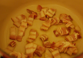 After all of this preparation, I was finally ready to get cooking! I preheated the oven to 300 degrees while I dropped the chopped bacon in the pan and let the bacon slowly crisp up.