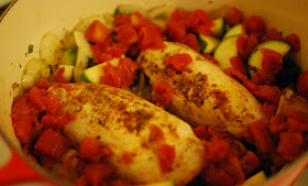 On Monday morning, I took out two boneless chicken breasts out of the freezer and let it thaw in the fridge during the day. I had a lot of great vegetables in the fridge, freezer and pantry that I wanted to utilize and decided to make a simple yet seasonal roasted vegetable medley to go along with my chicken. After a long workout at the gym that evening, I was excited to get to my hands dirty in the kitchen. Since Bret wouldn't be home until 8:30 PM, this would give me plenty of time to slowly prepare dinner and utilize my French oven.