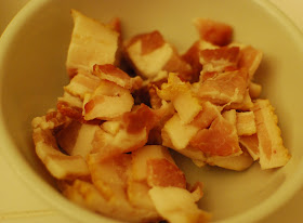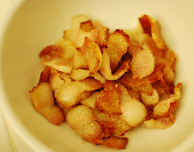 I kept an eye on the bacon and turned the pieces from time to time. I wanted the bacon to start to crisp up but not cook all the way through. When the bacon was ready, I removed it from the pan with a slotted spoon and set the bacon aside in a bowl.