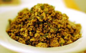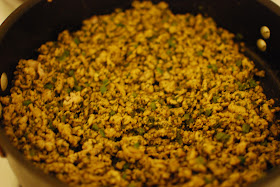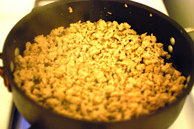 I warmed up a skillet on the stove at medium-high heat with a few tablespoons of vegetable oil.  The ground turkey was really lean so I kept a close eye on it to prevent it from over-cooking and becoming too dry.