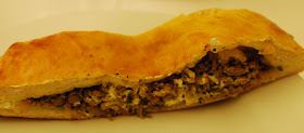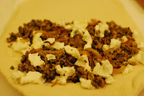 I then rolled out the pizza dough.  In hindsight I should have made two calzones but I was lazy and made one jumbo calzone.  I layered it with the caramelized onions and chunks of goat cheese, about 3/4 of the turkey mixture, and more onions and goat cheese.