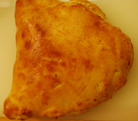 I baked the calzone on a parchment-lined baking sheet in the oven at 400 degrees for twenty minutes.  When the calzone was done it looked gorgeous  - crusty and golden brown.