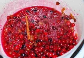 When the cranberries were soft and popped, I removed the Dutch oven from the heat and threw out the cinnamon stick. I poured the cranberry raisin mixture into the food processor and also added 2/3 cup of raspberry jam. The recipe called for seedless raspberry jam but I didn't have any on hand and in the end, the seeds didn't make any difference. I pulsed the ingredients until it was a thick but spreadable jam-like texture.