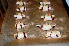 The rugelach baked in the oven for twenty minutes at 350 degrees. Although they weren't as neat as bakery-purchased rugelach, I was still pretty happy with the results. I let the rugelach cool before I packaged them up for the next day.
