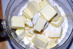 Friday night, the rugelach was the first thing I got started on. I cut two sticks of unsalted butter into two cups of flour in the food processor. I pulsed this mixture until it became a coarse crumbly mixture.