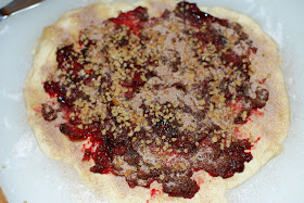 I took one ball of dough out and Bret rolled it out as close to a nine-inch circle as possible. Using a silicone pastry brush, I gently brushed the melted butter onto the dough. Bret spread 1/4 of the cranberry raspberry mixture onto the circle and I sprinkled 1/4 of the walnuts. Finally Bret sprinkled two teaspoons of the sugar and cinnamon mixture. It almost felt like we were making a pizza!