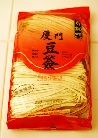 Jajangmyun is supposed to be a thick sauce and the trick is to add cornstarch to thicken the sauce up. I added a few tablespoons after the liquids came to a boil. Once this happens, I lowered the heat to let the stew simmer while I boiled some water. I found this package of bean strips at the grocery store and I decided to use these for my noodles. I put about half the package in the water and I found that these bean strips cook really quickly so just a minute or so in boiling water did the trick!