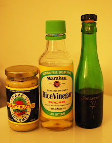 I wanted to make a mustard glaze for the mahi mahi so I put together a quick glaze using a few heaping tablespoons of spicy mustard, two tablespoons of rice vinegar and a splash of roasted sesame seed oil.
