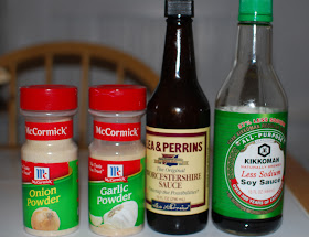 Bret and I decided to make steak tips for dinner on Tuesday night so on Tuesday morning, Bret put together a quick marinade for the steak tips to marinate in while we were at work.  He used a combination of soy sauce, Worcestershire sauce, onion powder, and garlic powder.  He also included salt, pepper and a dash of olive oil.
