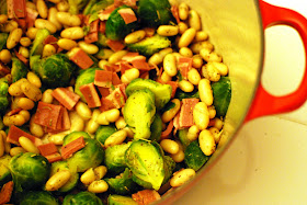 I rinsed and drained a can of cannellini beans and the beans were also added to the Dutch oven.  I seasoned the Brussels sprouts, turkey bacon and cannellini beans with salt, pepper, garlic powder, herbs de Provence, dried rosemary and a drizzle of herbs de Provence olive oil.
