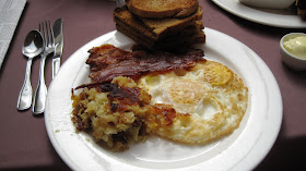 Bret and I each ordered two eggs but our dishes couldn't have been more different. Bret ordered his over-medium with crispy applewood smoked bacon, potato hash and a huge stack of anadama bread.