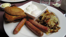 The breakfast was so hearty and I loved every bite, although I did find the potato hash needed a tad more salt. The sausages lacked the crispy texture I desired but was very flavorful and happily lacked the typical grease found in breakfast sausages. I've had the anadama bread here before and it never disappoints. Portions are large and I sadly left half of my potato hash and more than half of my toast behind although I gave a valiant effort to finish it all!