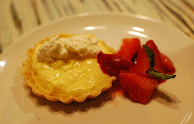 A lemon tart with whipped cream and the brightest strawberries.