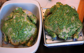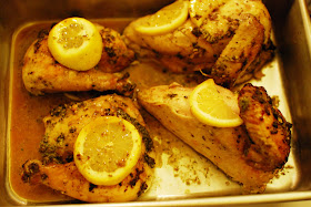 Once the chickens were broken down, they were arranged skin side up in two lightly greased roasting pans.  The lemon slices were added on top of the chicken and a combination of the cooking juices and two ounces of chicken stock were poured on top.