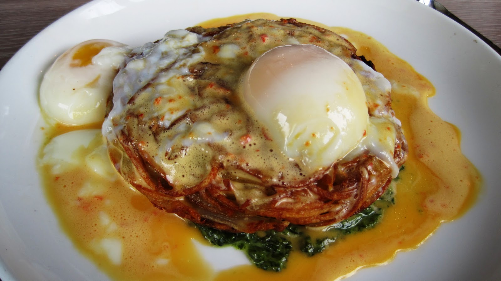 We wanted to start with the oysters but the restaurant was sadly out of both the oysters and the calamari. We were both seriously bummed because we had been talking about ordering oysters all week! Luckily, our entrees didn't disappoint. Kim ordered the Eggs Benedict, which came with the most adorable tower of homefries. I ordered the pork stuffed hash brown which had a layer of wilted spinach, pulled pork, hash brown and two fried eggs with a jalapeno hollandaise sauce. I asked for poached eggs instead (since I can't resist a good egg yolk) and this was definitely a good substitution.