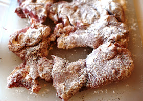 While I was working on the bacon, Bret seasoned the chicken with salt and pepper. I then dredged the chicken in flour.