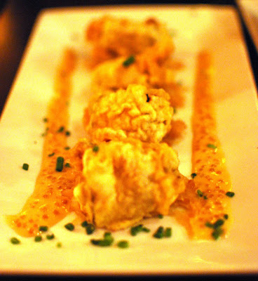 We were finally seated a little after 8:30 PM and we were all famished. To start, Bret and I split some appetizers with Justin and his wife Leah. First, we split the deep-fried pickles and pastrami. I honestly wasn't sure what to expect. I was envisioning a basket of pastrami topped with deep-fried pickles. Instead, this appetizer consisted of a thin slice of pastrami wrapped around a pickle and deep-fried with a tangy mustard and chopped onions. This definitely wasn't the healthiest first bite but it was certainly the tastiest.