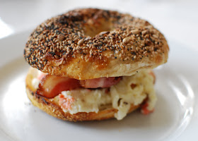 There's no recipe here. I just baked two slices of bacon in the oven at 350 degrees while I made an egg white scramble with shredded cheddar cheese and chopped smoked salmon. All of this went on a toasted everything bagel from