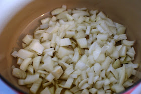 In my Dutch oven, I heated the olive oil at medium heat and added the chopped onion to the pan. I cooked the onion until it was dark brown around the edges.