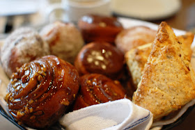 The breakfast started out with the most delightful basket of breakfast breads that included sticky pecan buns, doughnuts, and vanilla-almond scones.