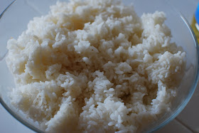 I started out by making three cups of rice in my rice cooker on Wednesday morning. I let the rice cool in the rice cooker all day long so that it was cold and less sticky. On Wednesday night, I gathered the rest of my ingredients: