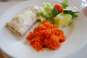 I had a strange dinner that night consisting of a frozen burrito, a side salad and mashed carrots.