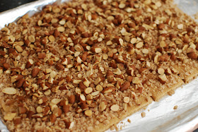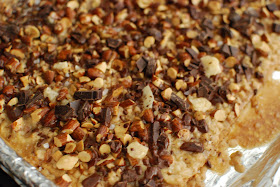 I preheated the oven to 350 degrees.  I lined a rimmed baking sheet with aluminum foil.  I placed the graham crackers in a single layer with the edges touching.  I sprinkled the toffee bits and almonds over the graham crackers.  (Thanks Bret for chopping up the almonds!)